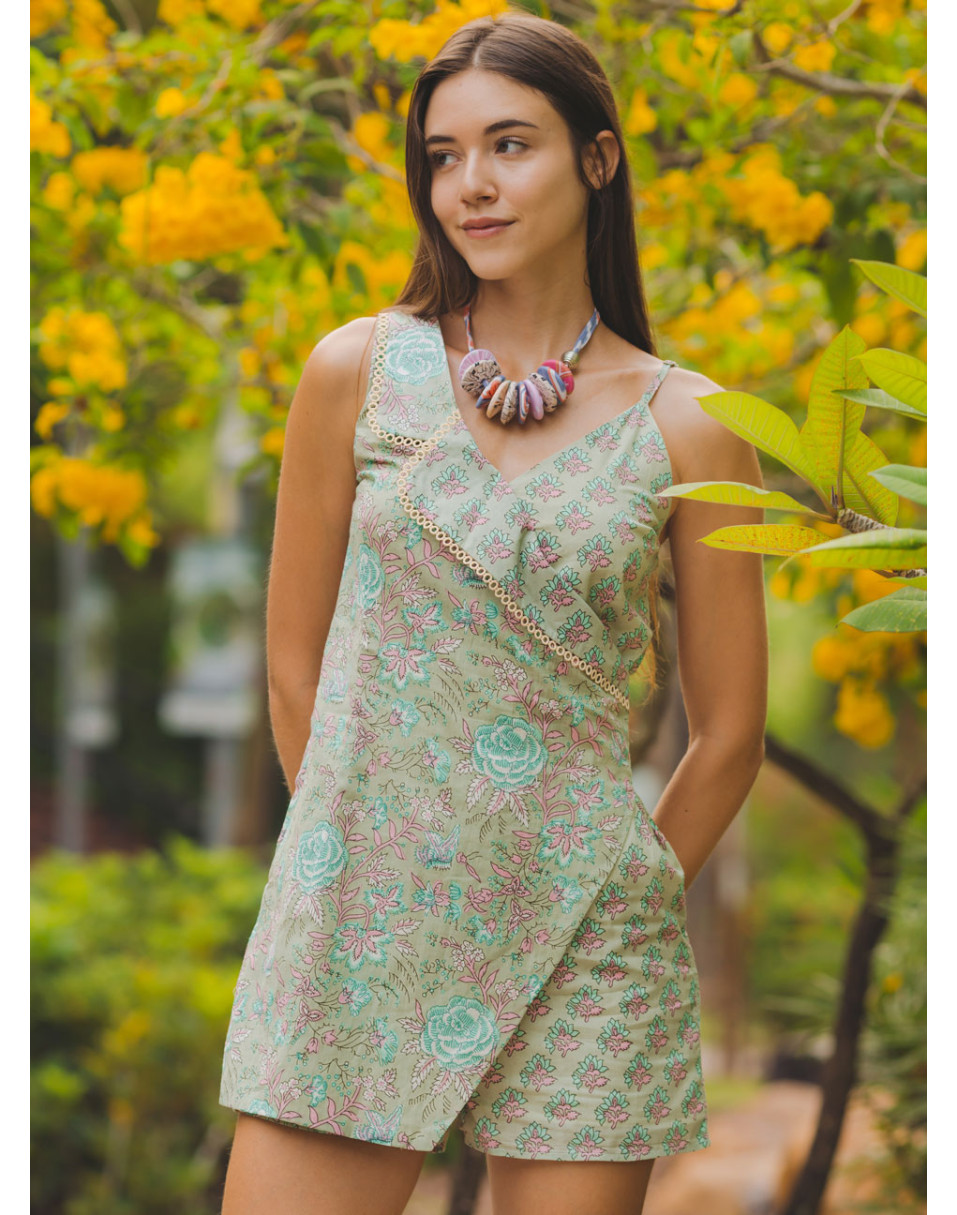 - 100% Cotton. Back Zip. Artisan Block Prints. Adjustable Back Straps.