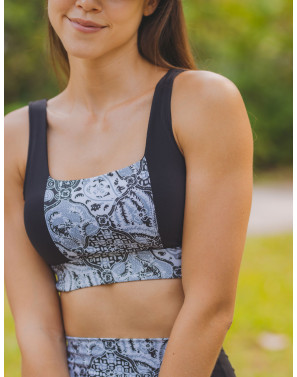 A hybrid of the street style ribbing and heritage batik prints. This square neck sports bra elevates your gym chic style that turns heads.