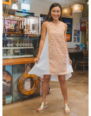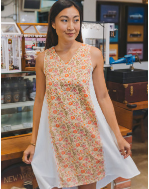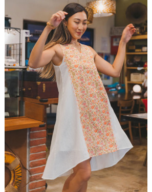 Totally at ease in a lightweight swing dress with artisan block prints and hand stitch details.