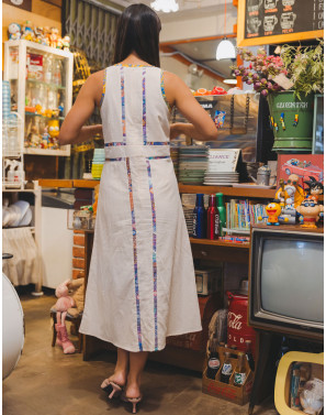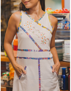 Be ready to turn heads in this Jap-Orient fusion dress with batik patchwork strips and cherry blossom embroidery.