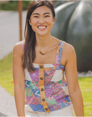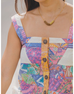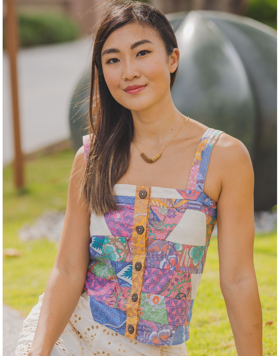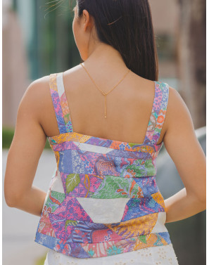 Gentle pastel shades of patchwork, detailed with eyelet embroidery on a tank top for a soft, feminine style.