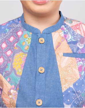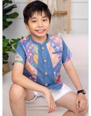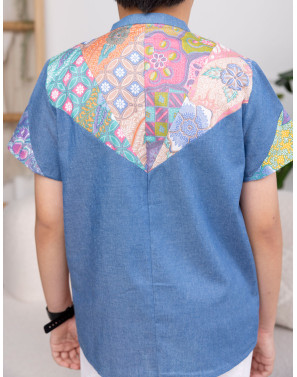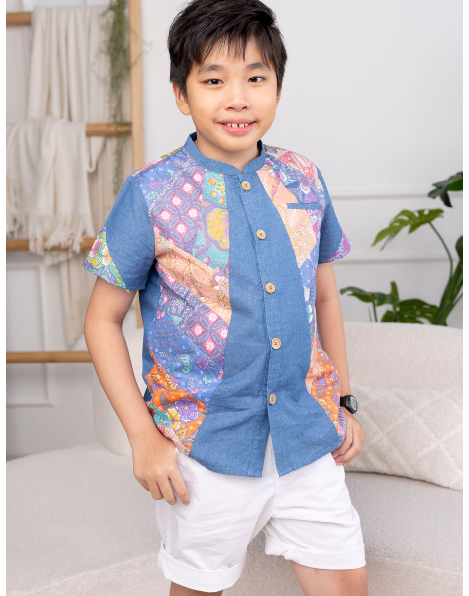 Designed to bring your loved ones together in style, this unique set blends the rich heritage of batik with the casual coolness of denim, offering a contemporary take on traditional family outfits. Son wears a casual smart shirt with pastel batik patchwork in a relaxed silhouette.
