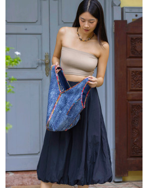 Vest to bag version 2.0! With shimmering studs and vibrant batik trim, this unique vest-to-bag is a fusion of glamour, style, and practicality. Designed for those who love to stand out while keeping the heritage prints alive!