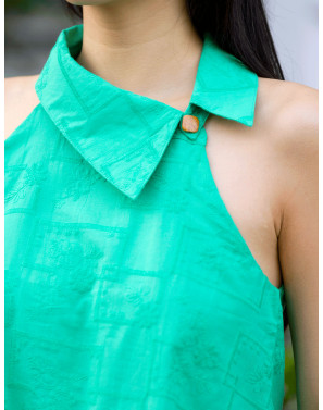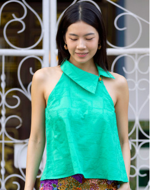 Featuring a geometric embroidery that pops against its sleek, minimalist design, this asymmetrical collar blouse adds an edgy, modern flair to any outfit, making it perfect for the fashion-forward who dare to stand out.