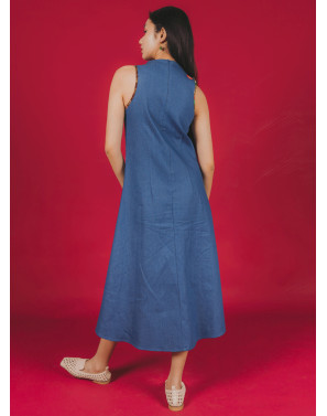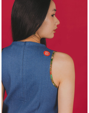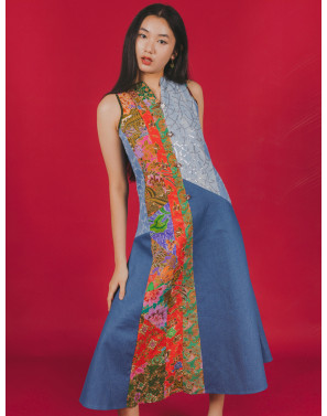 A denim batik patchwork maxi dress inspired by cheongsam details, reimagined with a relaxed modern silhouette. Think distressed denim meets traditional elegance, with a splash of bling. It’s a beautiful mess — a little chaos in the classic, a little glam in the grounded. Effortlessly bold, yet casually cool. The epitome of uniquely Singapore.