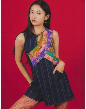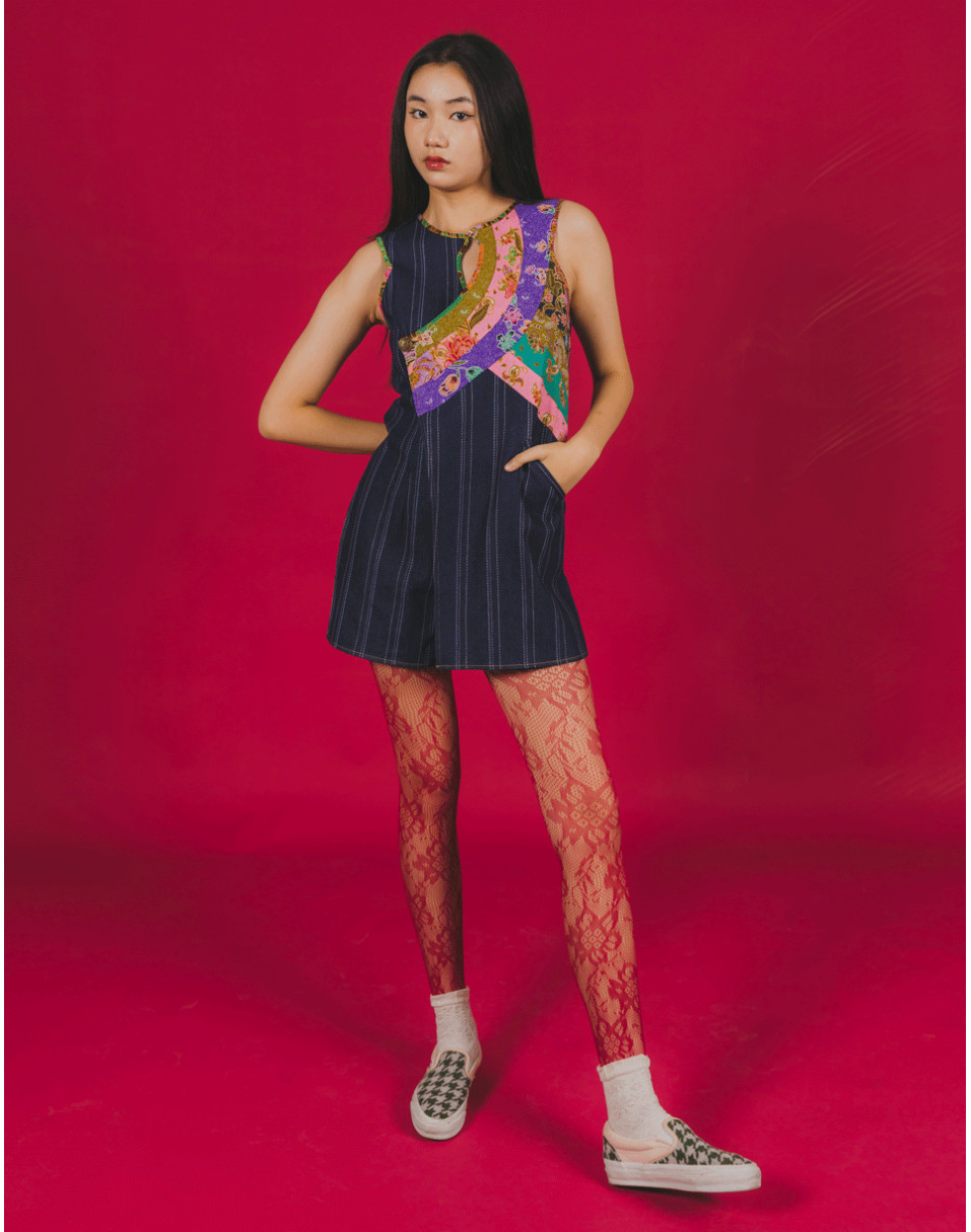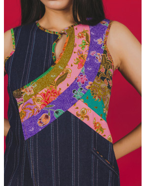 A bold denim jumpsuit reimagined with sharp vertical pinstripes and fluid batik patchwork in vivid bursts of colour. Classic meets playful in this modern silhouette—tailored yet unexpected, with a functional pocket for everyday ease. Just like Singapore, it’s modern, conservative, and playful all at once. Designed to stand out. Made to be uniquely you.