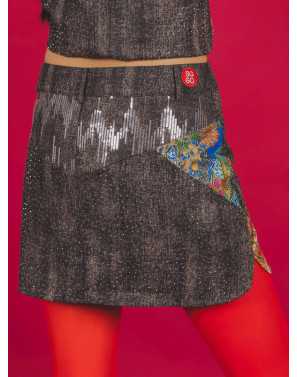 Meet your new power piece: a pair of skorts crafted in inky black denim, boldly spliced with vibrant batik patchwork. Embellished with sequins and silver studs, it brings the right balance of shimmer and grit. Equal parts street, heritage and rock star rebellion. Defining the Singaporean generation of today - bold, adventurous, with an against all odds attitude, and a deep respect for where they came from.