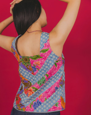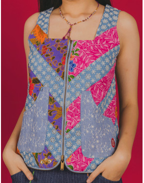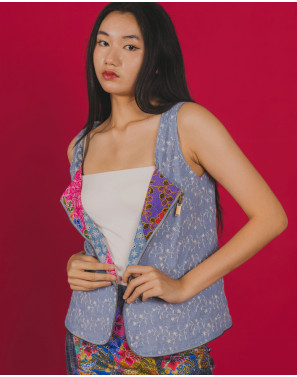 This convertible piece redefines functionalty with a rebellious twist. Designed with bold batik patchwork and grounded in denim eyelet, it transforms effortlessly from a statement vest to a carry-all bag (on both sides!). Like the Singaporean spirit, it's versatile, adventurous, creative, and deeply rooted in culture. Crafted for the movers, the dreamers, and the shape shifters of today.
