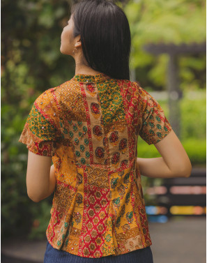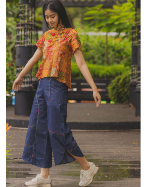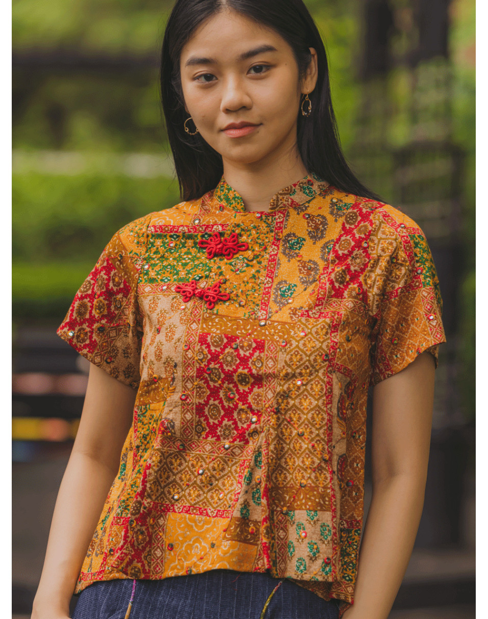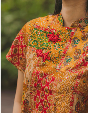 Traditional Indian block print and mirrorwork collide with the sleek silhouette of a cheongsam, creating a statement piece that’s both heritage-rich and unapologetically modern. Designed for the bold, worn by the fearless, this is cultural fusion redefined.