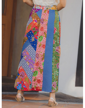 A super cool batik denim patchwork skirt in a flattering A-line silhouette that transcends all seasons. A modern twist on heritage, because tradition has never looked this cool.