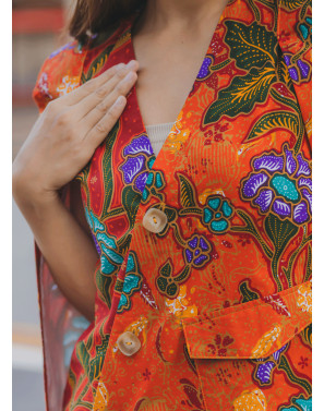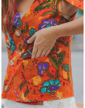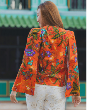 A versatile batik cape jacket that shines both as an outer layer or worn solo. With its dramatic flair and distinctive craftsmanship, it creates an effortlessly commanding, one-of-a-kind look.