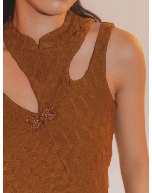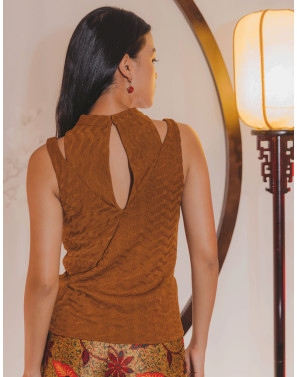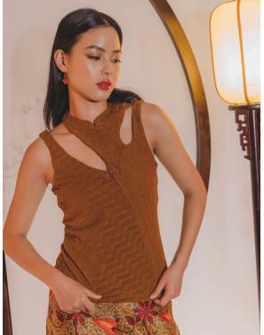 A cheongsam-inspired cut-out tank top that is ultra-modern, sleek, and unmistakably unique. Textured panels with contrasting weave directions add subtle intrigue and elevate the clean, contemporary silhouette.