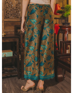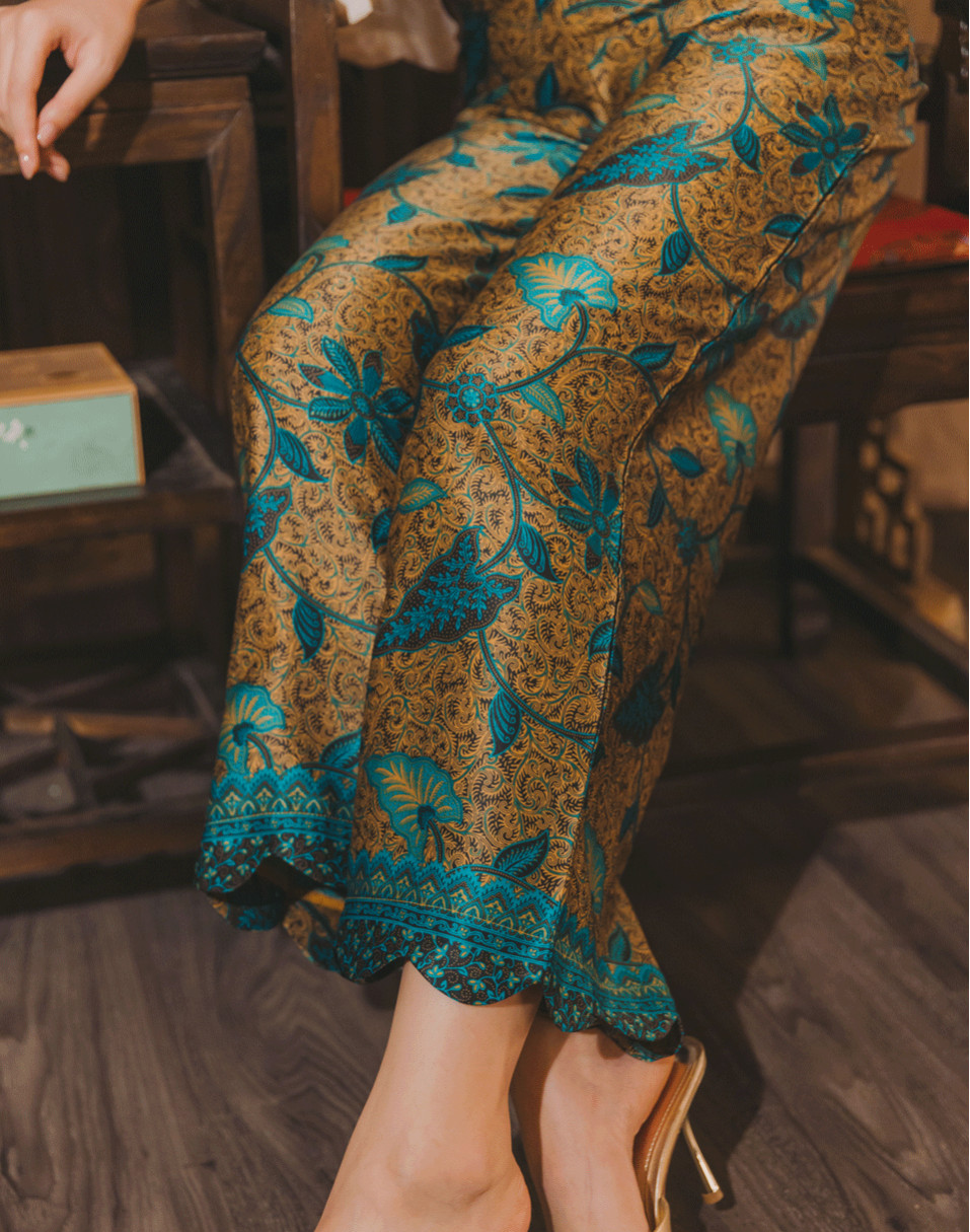 Luxurious gold batik finished with a beautifully scalloped hem. A piece that marries classic elegance with rich heritage, celebrating the timeless artistry of traditional batik.