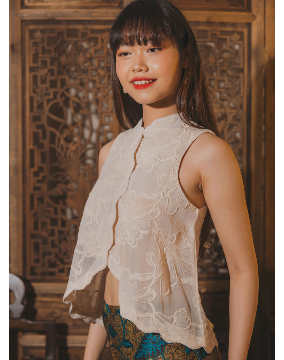 Soft nude shades, a layered scalloped hem and gentle embroidery come together in this high-low cheongsam top, exuding understated oriental elegance. Flattering, feminine and endlessly versatile, it’s designed to be worn on repeat.