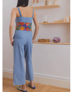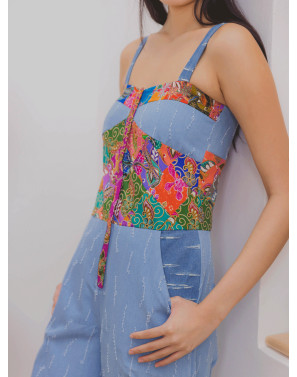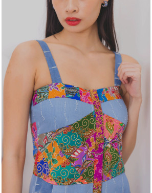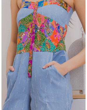 Where rebel spirit meets rooted heritage. This statement jumpsuit is designed for the woman who refuses to choose between edge and elegance. Crafted from structured denim and accented with authentic batik patchwork, it fuses grunge rock attitude with rich ethnic artistry in one unapologetically bold silhouette.