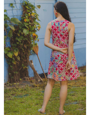 A Peranakan-inspired dress that blends heritage with modern ease. Framed by a scalloped, vintage-style neckline and accented with batik cap prints, it carries a soft, romantic charm with a touch of cheer.