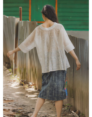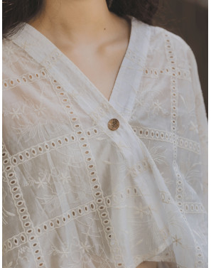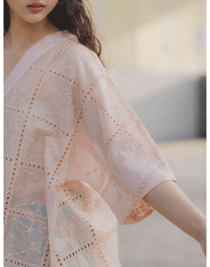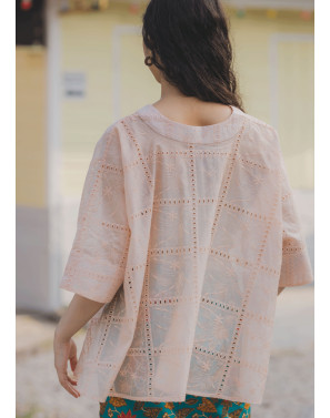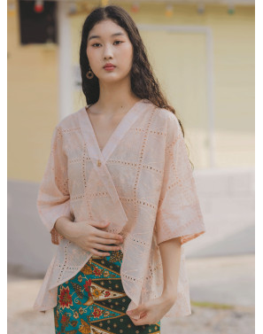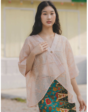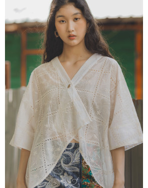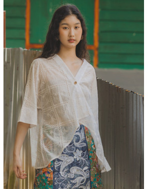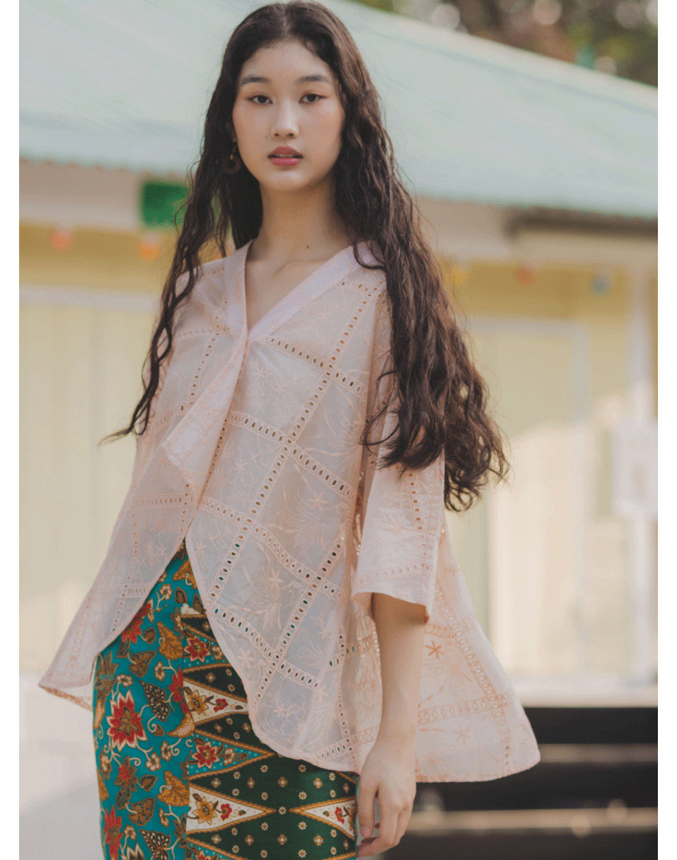 A fresh reinterpretation of the classic kebaya, this oversized piece features a fluid, drapey silhouette designed to flatter every body from XS to XXL. Thoughtfully crafted with squarish geometric embroidery and subtle eyelet details, it brings a clean, modern edge to traditional lace. The high-low hemline adds movement and a touch of romance.